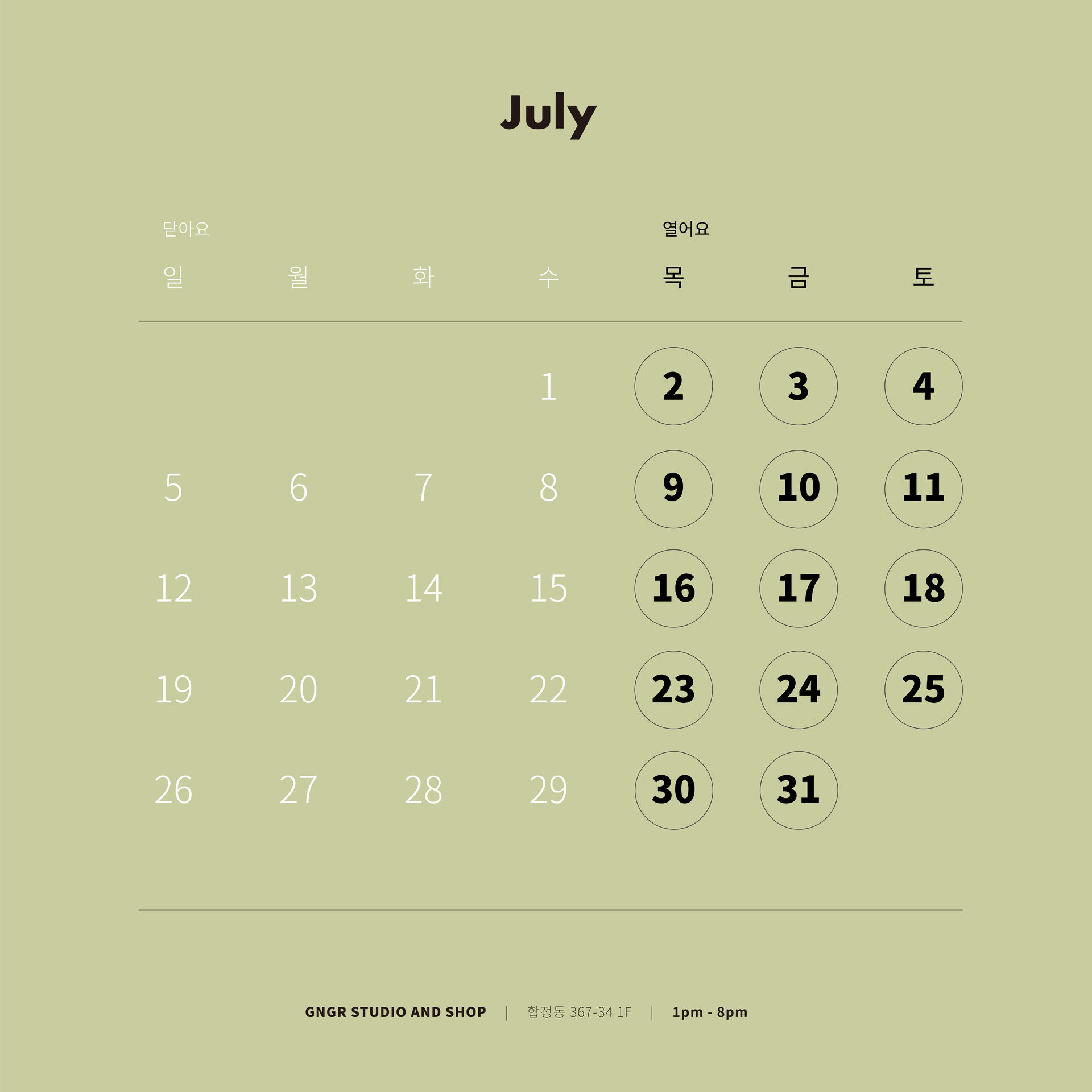 진저아이웨어의 쇼룸은 목~토요일, 1시부터 8시까지 오픈합니다. 월, 화, 수 는 예약제로 운영되오니 링크를 통해 이용해주세요. 감사합니다.