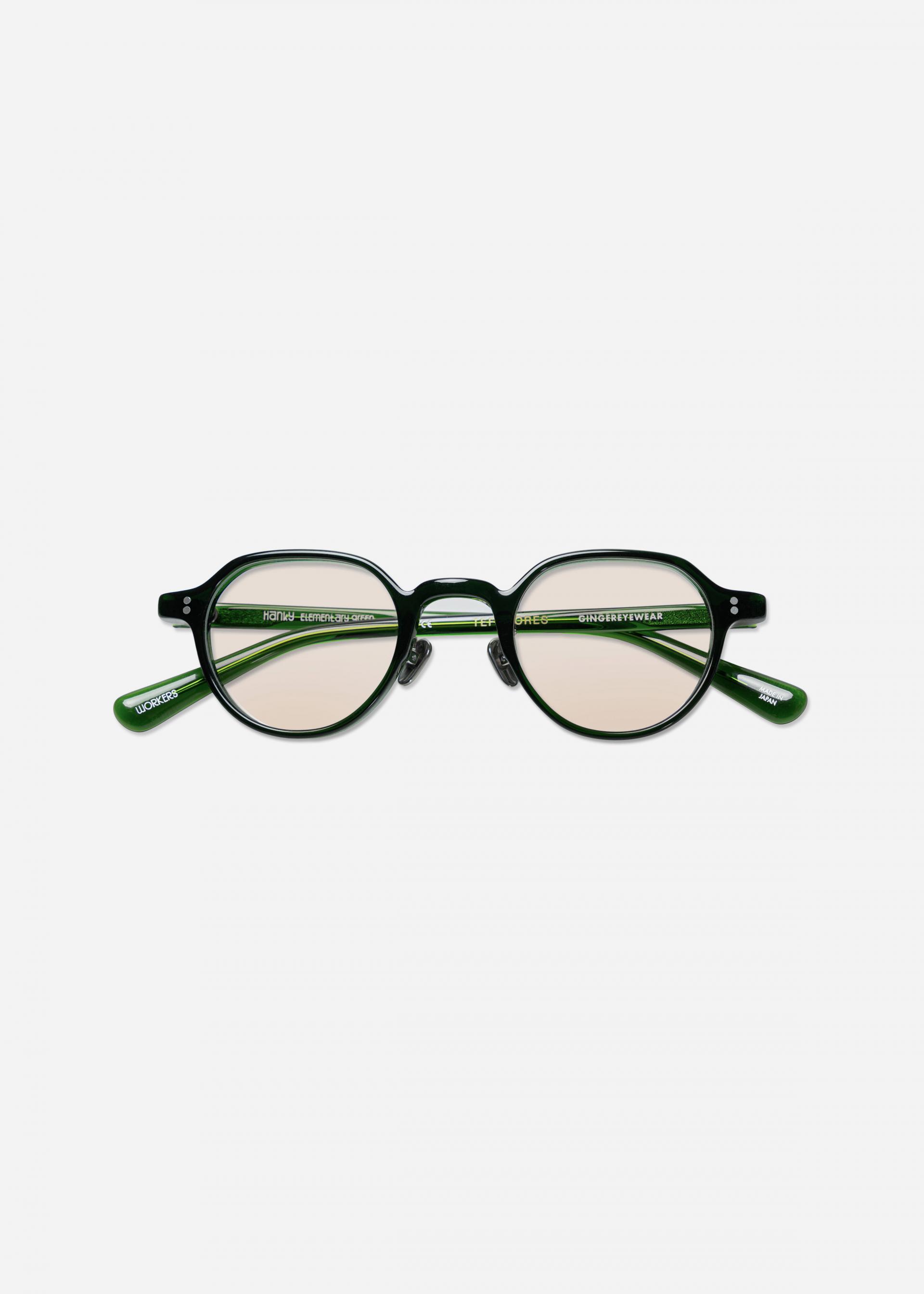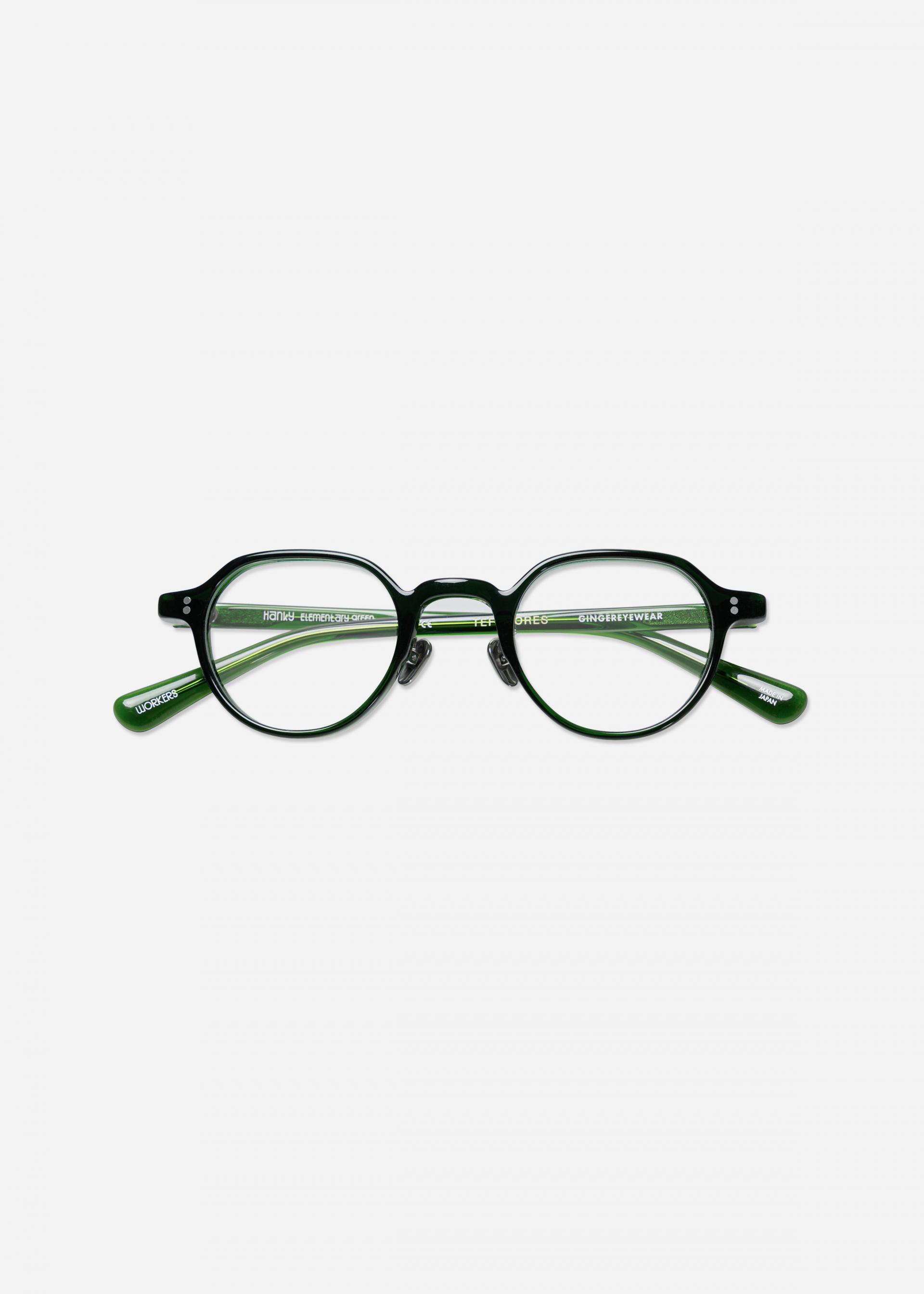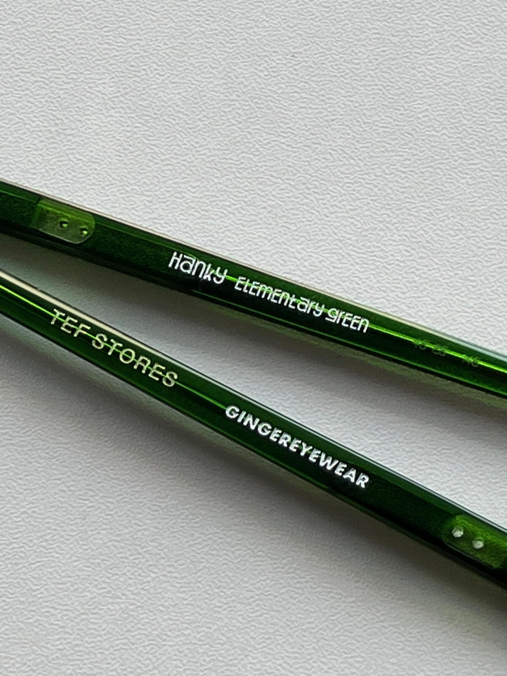 유년기 처음 사용했었던 플라스틱 소재의 색상을 상상하며 만들어진 제품입니다. Elementary Green 이라는 새로운 색상명으로 선보이는 Hanky 제품은 이탈리아 브랜드 MAZZUCCHELLI(마츠켈리)사의 아세테이트 소재를 사용하였으며 일본의 후쿠이현에서 만들어졌습니다. 채광의 유무에 따라 검정으로 보이기도 새초롬한 그린 컬러로도 보여집니다. 시력교정 및 보호의 목적으로 사용하는 도구로서 안경을 다루지 않기 때문에 데모 렌즈를 사용하지 않고 블루 라이트 렌즈 혹은 대드 카키-틴트를 사용하였습니다. 다소 작아 보일 수 있는 안경의 사이즈는 여유 있는 브릿지의 길이 덕분에 보통의 안경과 같이 적당한 사이즈와 균형감을 느낄 수 있습니다.